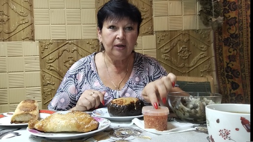 Мукбанг 😋👍. Фаршированный баклажан, самса с говядиной, шаурма, хреновина, чай.