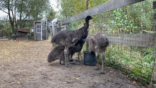 У самца африканского страуса продолжается брачный сезон; малыши эму подросли - им 3-4 месяца. В конце видео курч брама парцелян