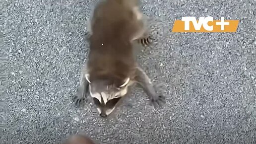 Маленький енот скрутился в клубочек и лежал на дороге один