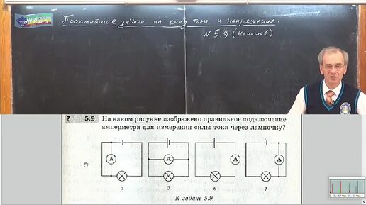 Задача на определение правильности схемы по подключению амперметра в электрическую цепь для измерения силы тока, проходящего через лампочку