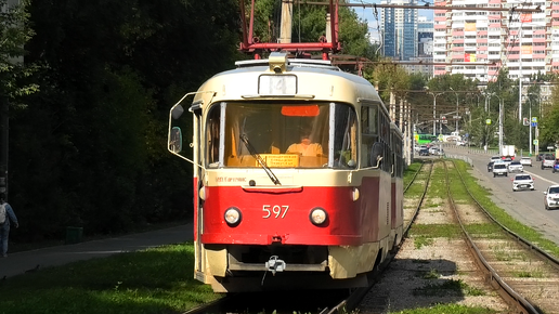 Трамвай Екатеринбурга Tatra T3SU СМЕ борт. №597/598 маршрут 14 прибывает на остановку "Ювелирная"