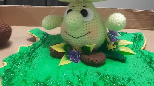 Поделка, Вязаный гриб с глазками на листочке.