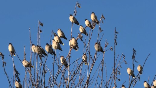 Стая Свиристелей греется на вечернем осеннем солнышке.