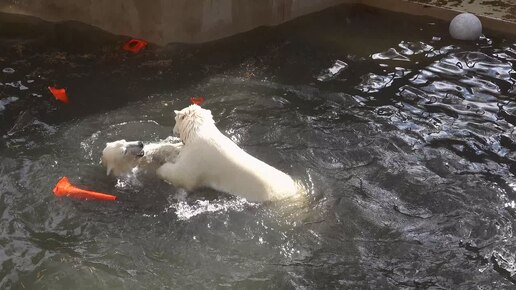 Стрелка играла в бассейне, а Белка прыгнула в бассейн побороться. 05.10.2025