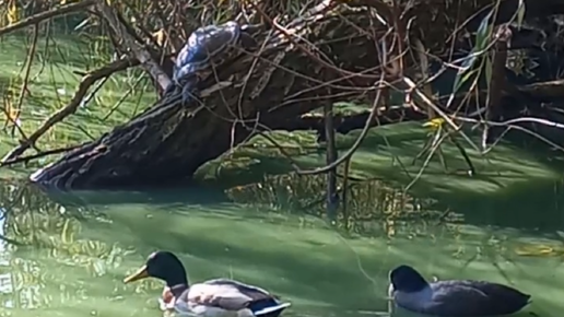 Черепаха в дикой природе рядом с кряквой и лысухой) Близкая съемка #STR