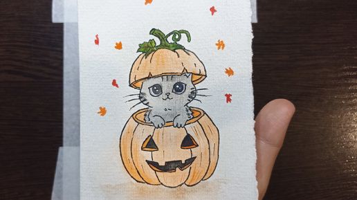Рисунок акварелью / Котик в тыкве