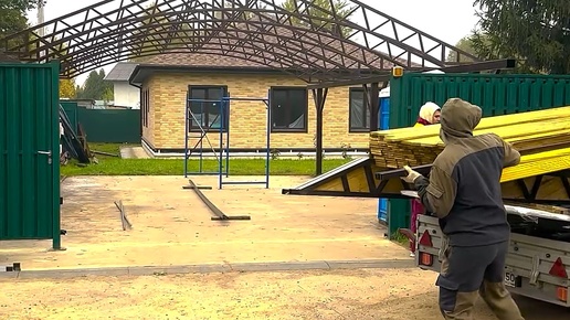 Большой двускатный навес из профлиста во дворе частного дома для автомобилей