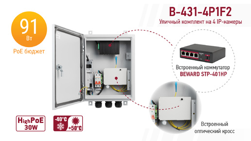 BEWARD B431-4P1F2: уличный неуправляемый коммутатор, 4 порта с поддержкой High PoE, PoE бюджет 91 Вт, встроенный SFP модуль, от -40 до +50°С