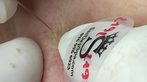 Сальные пробки акне и угри. Косметолог делает чистку лица.
