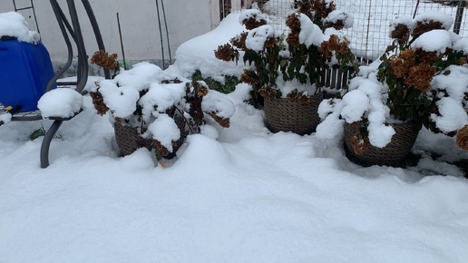Выпал снег. Обрезать соцветия на метельчатых гортензиях или нет. 10.10.2025г