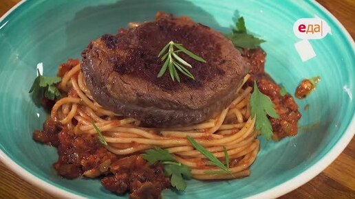 Стейк с пастой в томатном соусе. Салат с фетой и арбузом | Наедине с Мосиным