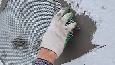 Кусок Фасадной Сетки втапливается в клей на сдир, устанавливается под углом 45 градусов на углах оконных проёмов. СФТК Мокрый Фасад, ППС16ф