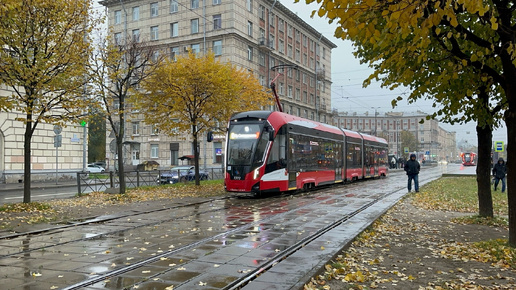 «Золотой осенью!» Трамвай «Невский» (71-932) №7777 на Новочеркасском пр., октябрь 2025 года