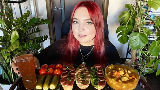 МУКБАНГ | Гуляш с яблоком, бутерброды с колбасой, огурцы, компот 🌭