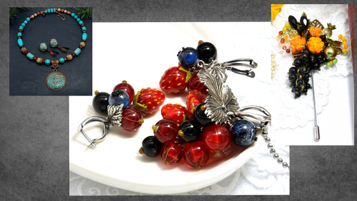 Кулон и серьги с ягодами из стекла. Брошь - букет. Колье и серьги с муранским стеклом и камнями.
