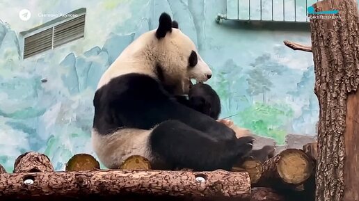 панда Катюша нашла и грызет бамбук. какая она смешная!