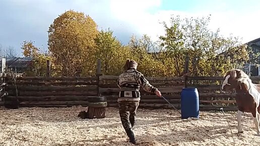 Отработка уступки плеча вокруг бочек на рыси. Рабочий процесс