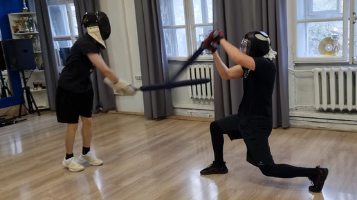 Спарринг на длинных плоских полуторных японских мечах чанбара катана в школе кэндзюцу Katana Club