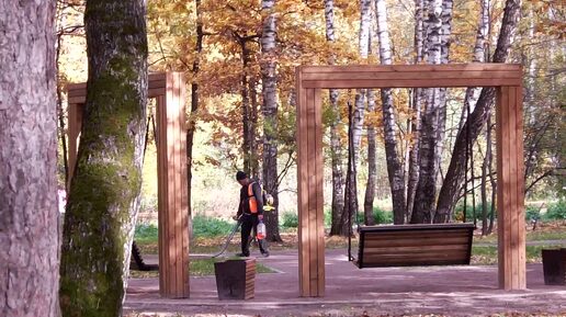 Во всех скверах и парках страны. Уборка листьев воздуходувкой