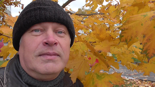 Геннадий Горин на фоне жёлтых листьев. Жёлтые листья клёна. Октябрь, осень 2025 год