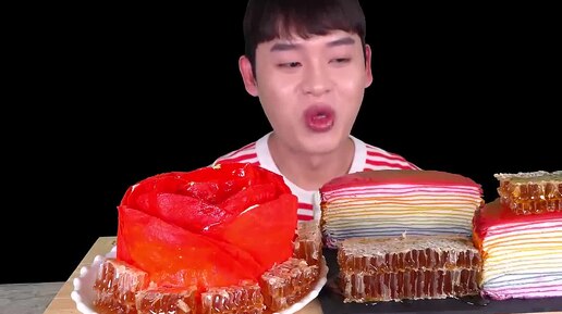 ASMR Поедание тортов: бочка меда, розовый креп и радужный креп-торт