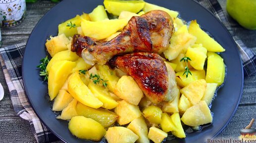 Куриные голени, запечённые с айвой, картофелем и имбирём