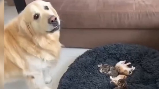 Золотистый ретривер негодует: почему котята спят на его лежанке?!