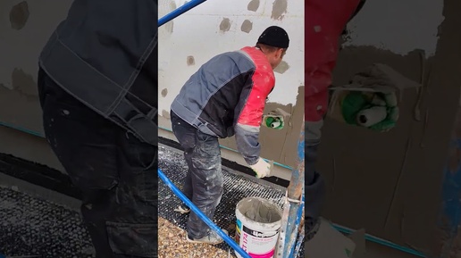 Нанесение клея на поверхность пенополистирола металлической тёркой, втапливание Панцирной Сетки