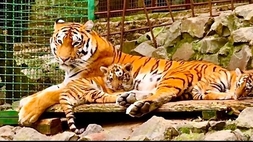 Тигрица с тигрятами обрадовались появлению папы тигра!