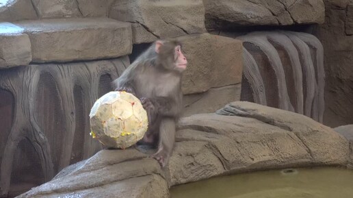 Японская макака роняет мяч в бассейн, но в воду заходить не хочет. 16.10.2025