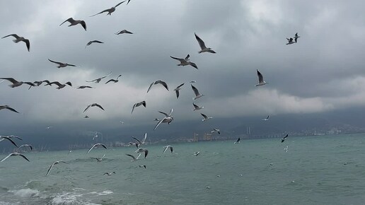 Новороссийск. Ветер, море, волны, парящие в небе чайки.