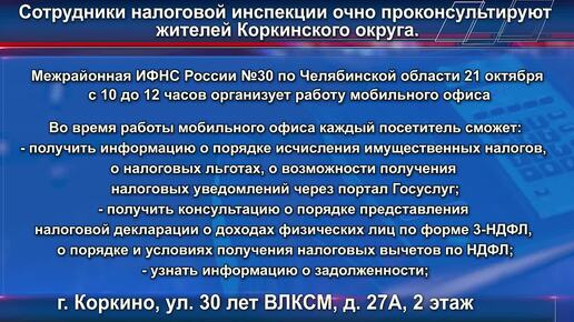 Сотрудники налоговой инспекции очно проконсультируют жителей Коркинского округа.