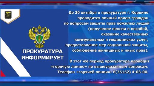 Прокуратура города Коркино продолжает личный прием и «горячую линию» по вопросам защиты прав пожилых людей.