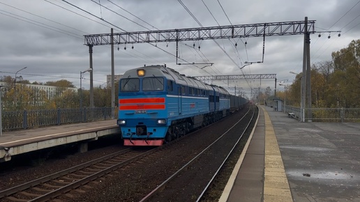 «Синяя с валютой!» Тепловоз 2ТЭ116У-0054 с грузовым поездом на пл.Сосновая Поляна, октябрь 2025 года