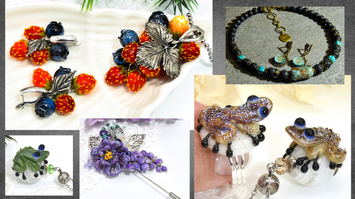 Украшения с ягодами из стекла ручной работы. Кулон и кольцо с лягушатами. Элегантный чокер. Сиреневая брошь с агатом.