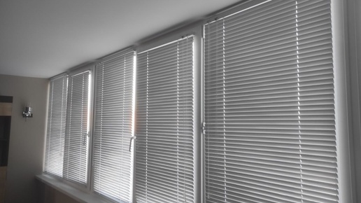 Стильное и практичное решение для оформления лоджии белые горизонтальные алюминиевые жалюзи. Комфорт и приватность в любое время дня.
