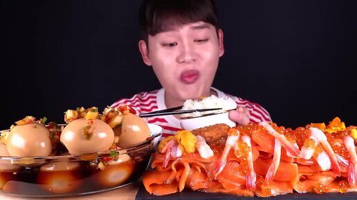🍣 ASMR: Лосось, креветки и икра с рисом 🐟 Свежайшие морепродукты, сочный лосось и хрустящие яйца в соусе — идеальное комбо для мукбанга!