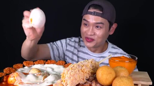 ASMR Водопад из сыра с токпокки и картофелем, рисовые сосиски в тесте, сладкий картофель и кимбап ~!! Сырное фондю с токпокки и корн-догами