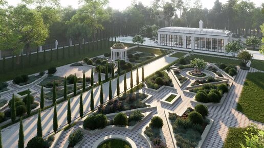 Архитектурная концепция павильона в классическом стиле и регулярного сада