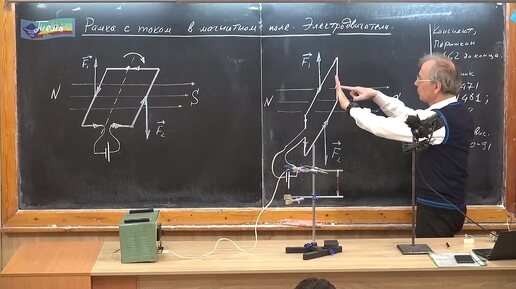 Вертикальная рамка с током, с действующей на нее магнитным полем и растягивающими ее силами Ампера.