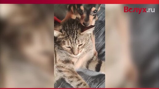 Щенок и кошечка обнимаются
