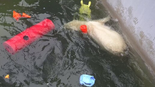 Стрелка наблюдает с берега как Белка в бассейне играет. 22.10.2025