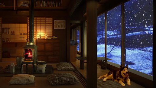 Уютное видео домика с потрескиванием дров в печке, шумом чайника и хаски во время снегопада.