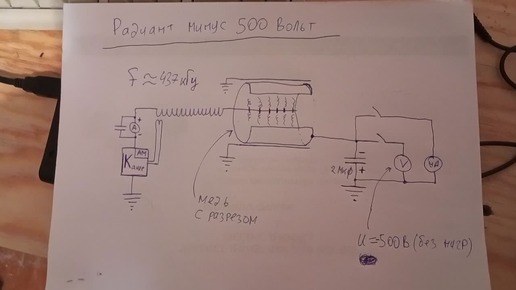 Тесла качер 437 кГц в однородном магнитном поле. Попытки увидеть влияние маг поля на радиант. Схема