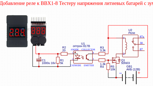 Добавление реле к BBX1-8 Тестеру напряжения литиевых батарей с зуммером.
