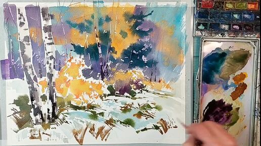 Первый снег, живая акварель