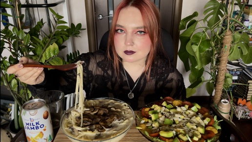 МУКБАНГ | Паста сливочная с грибами, салат с манго, пина колада 🍝🥗