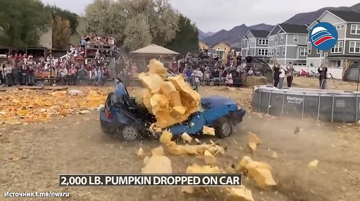 Гигантская 900-килограммовая тыква раздавила старый автомобиль на фестивале