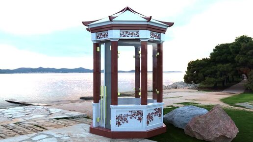 Беседка на могилу с колоннами из гранита Шокша и невысоким забором из мрамора Коелга с гравировкой веток де956