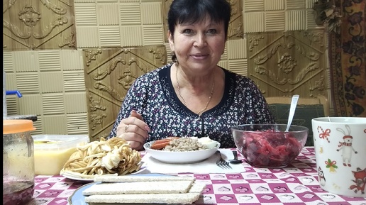 Мукбанг 😋👍. Гречка, колбаса, яйцо, винегрет, хлебцы, масло, варенье малиновое, чай.